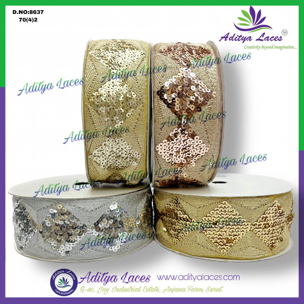 Enhance your ethnic and designer creations with this premium embroidery lace, crafted on golden tissue fabric using a high-precision embroidery machine. The design features a rich combination of zari work, 5mm & 3mm sequins, and elegant cording, giving it a luxurious shine and intricate texture. With a length of 9 meters and a width of 1 inch, this lace is perfect for adding a refined decorative touch to a wide range of garments and accessories. Ideal for sarees, lehengas, dupattas, suits, gowns, blouses, and various decorative or craft projects.
