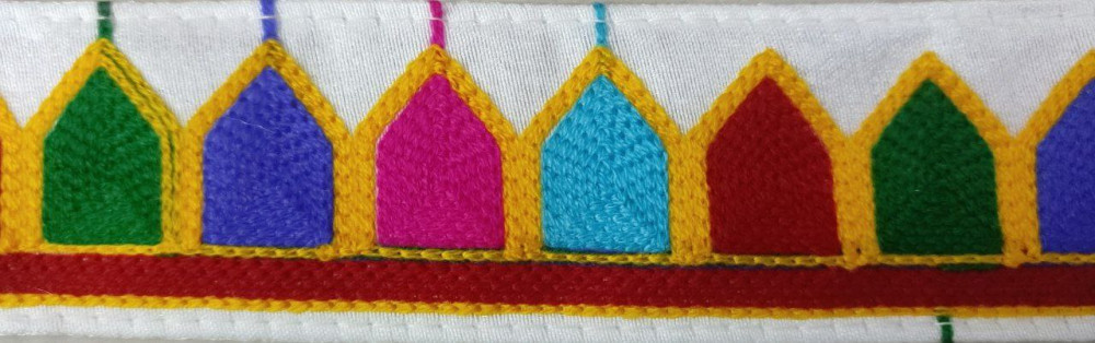 Colorful Gamthi lace crafted with embroidery, handwork, and mirror work—perfect for enhancing Garba dresses, chaniya cholis, and festive outfits with a vibrant traditional touch