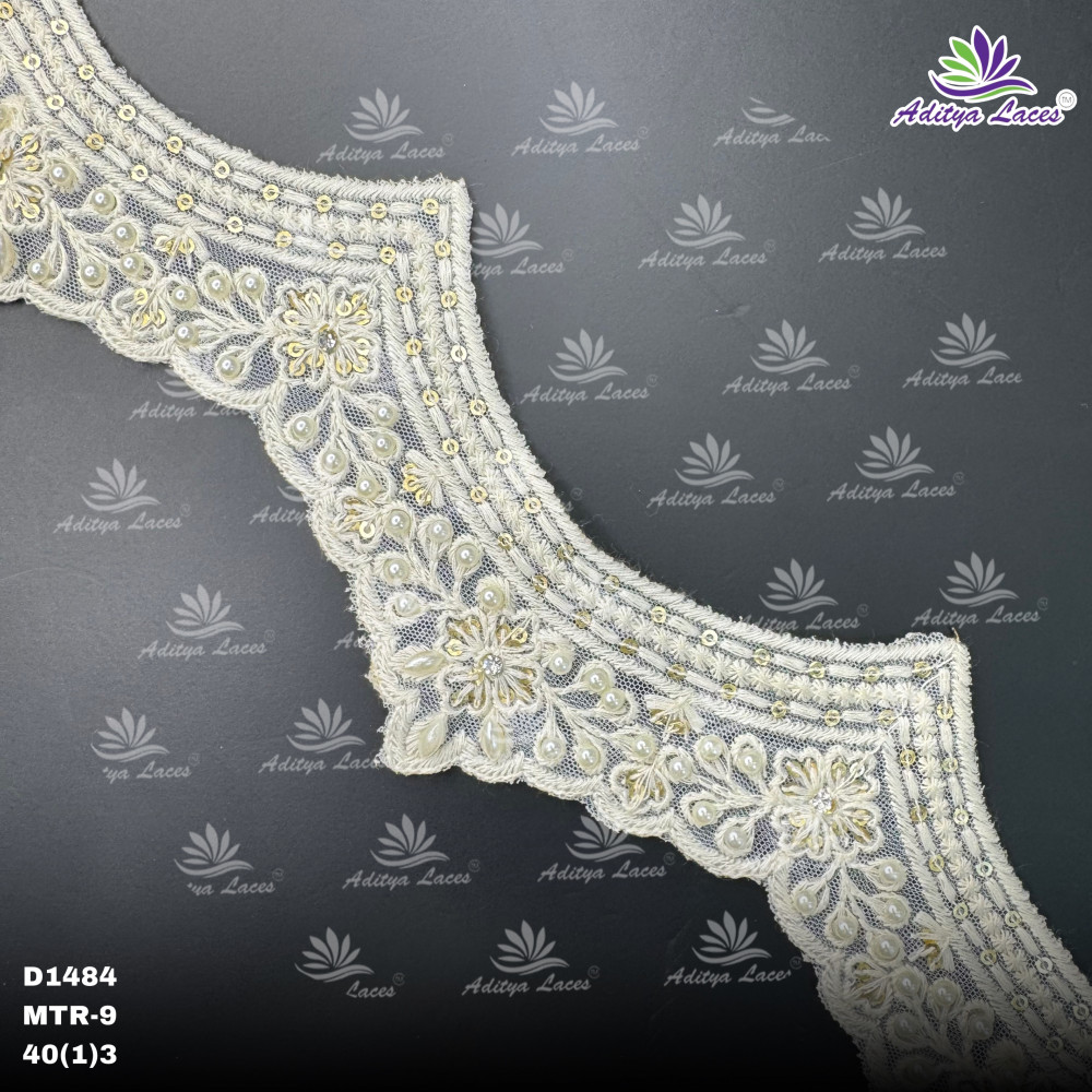 Dyable lace in white and off-white, designed for easy coloring into any shade, ideal for sarees, dupattas, dresses, and designer wear, offering smooth dye absorption, fine detailing, and flexibility for custom styling in a convenient 9-meter roll.