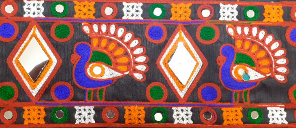 Colorful Gamthi lace crafted with embroidery, handwork, and mirror work—perfect for enhancing Garba dresses, chaniya cholis, and festive outfits with a vibrant traditional touch