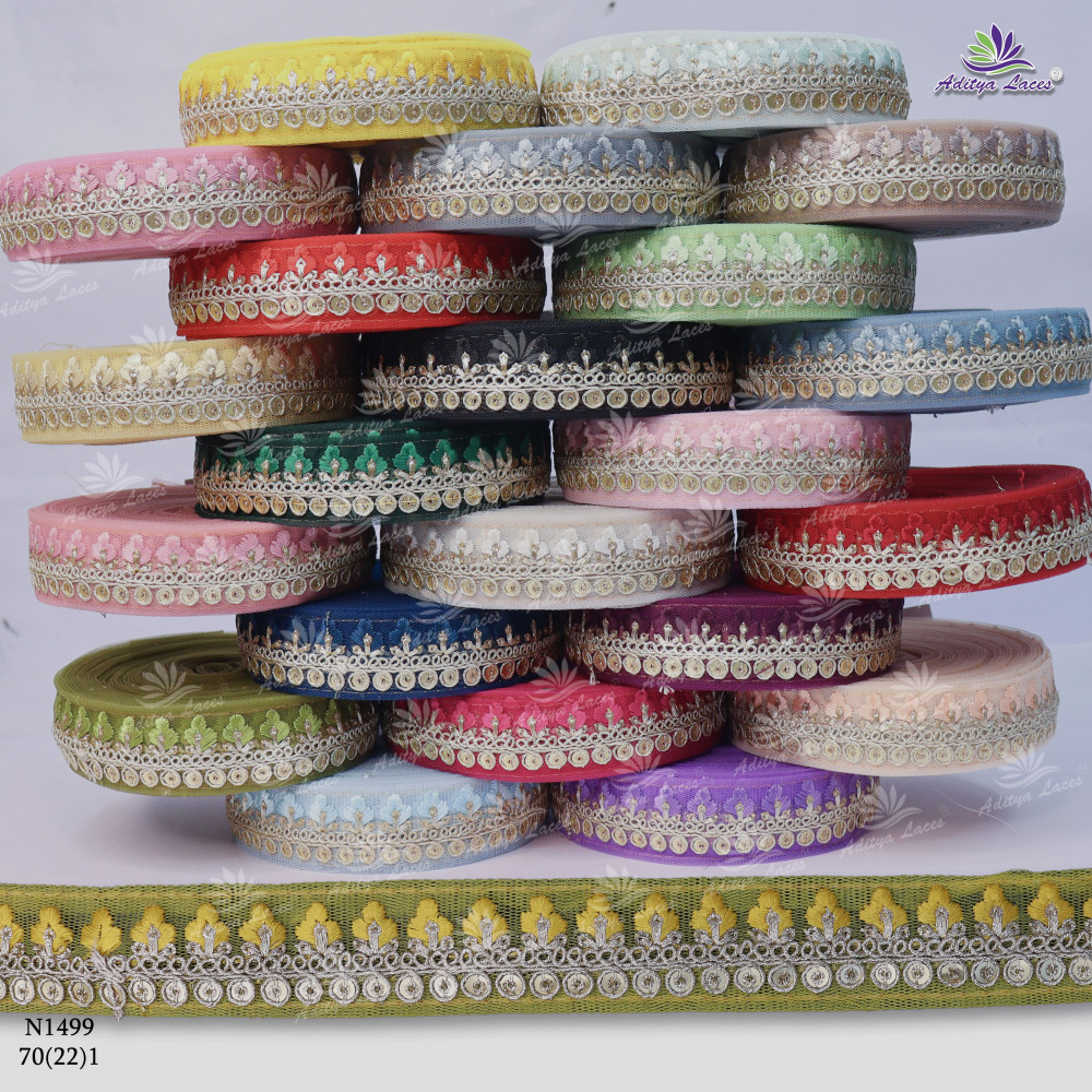 Enhance your ethnic and contemporary creations with our premium Net Embroidered Lace, crafted to add elegance and richness to any outfit or accessory. Designed on high-quality net fabric, this lace features intricate embroidery using 3mm shimmering sequins, fine-quality threads, and luxurious zari cording that creates a stunning textured effect. The lightweight net base ensures smooth draping and easy stitching, while the detailed sequin pattern adds a striking sparkle without making the lace too heavy. This 2.5-inch wide lace is ideal for elevating sarees, lehengas, blouses, gowns, dupattas, and festive décor items. Available in a 9-meter roll, it’s perfect for designers, boutiques, crafters, and manufacturers looking for consistency in finish and color. Choose from multiple vibrant and subtle colors to match every style, season, and occasion.Features: