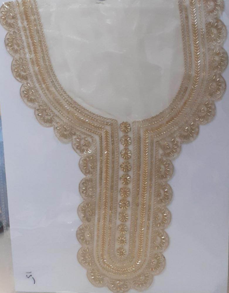 Ready-made neck designs are widely used in dresses, kurtas, and salwar suits to add instant elegance and richness to any outfit. Crafted with beautiful embroidery work, fine handwork, and decorative detailing, these neck pieces enhance the front neckline of garments without the need for heavy stitching or design work. Each neck pattern is carefully designed to match traditional, festive, and daily-wear styles, making it easy for designers and tailors to create premium-looking outfits in less time.Available in different shapes and sizes based on the neckline design, these ready necks are perfect for elevating simple fabrics into stylish, finished garments. Their detailed craftsmanship gives every dress a refined and fashionable appearance.