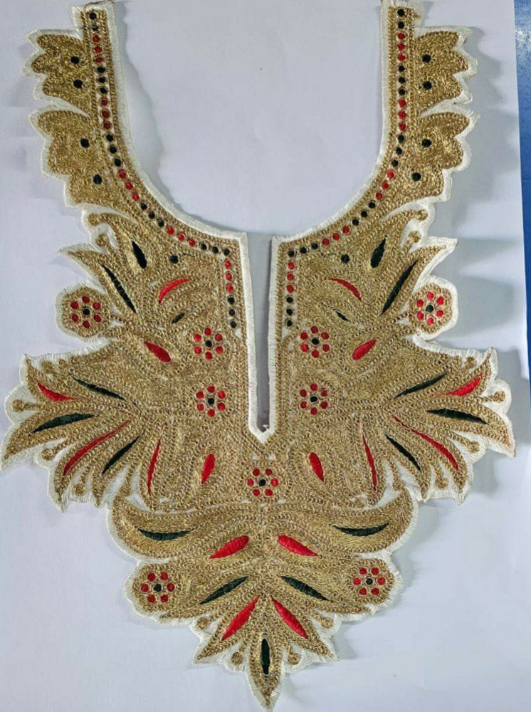 Ready-made embroidered neck designs with added handwork, perfect for dresses, kurtas, and salwar suits. Easy to stitch and available in various shapes, they instantly add richness and a premium finish to any outfit.