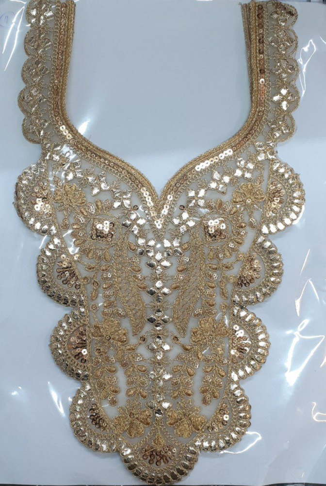 Ready-made neck designs are widely used in dresses, kurtas, and salwar suits to add instant elegance and richness to any outfit. Crafted with beautiful embroidery work, fine handwork, and decorative detailing, these neck pieces enhance the front neckline of garments without the need for heavy stitching or design work. Each neck pattern is carefully designed to match traditional, festive, and daily-wear styles, making it easy for designers and tailors to create premium-looking outfits in less time.Available in different shapes and sizes based on the neckline design, these ready necks are perfect for elevating simple fabrics into stylish, finished garments. Their detailed craftsmanship gives every dress a refined and fashionable appearance.