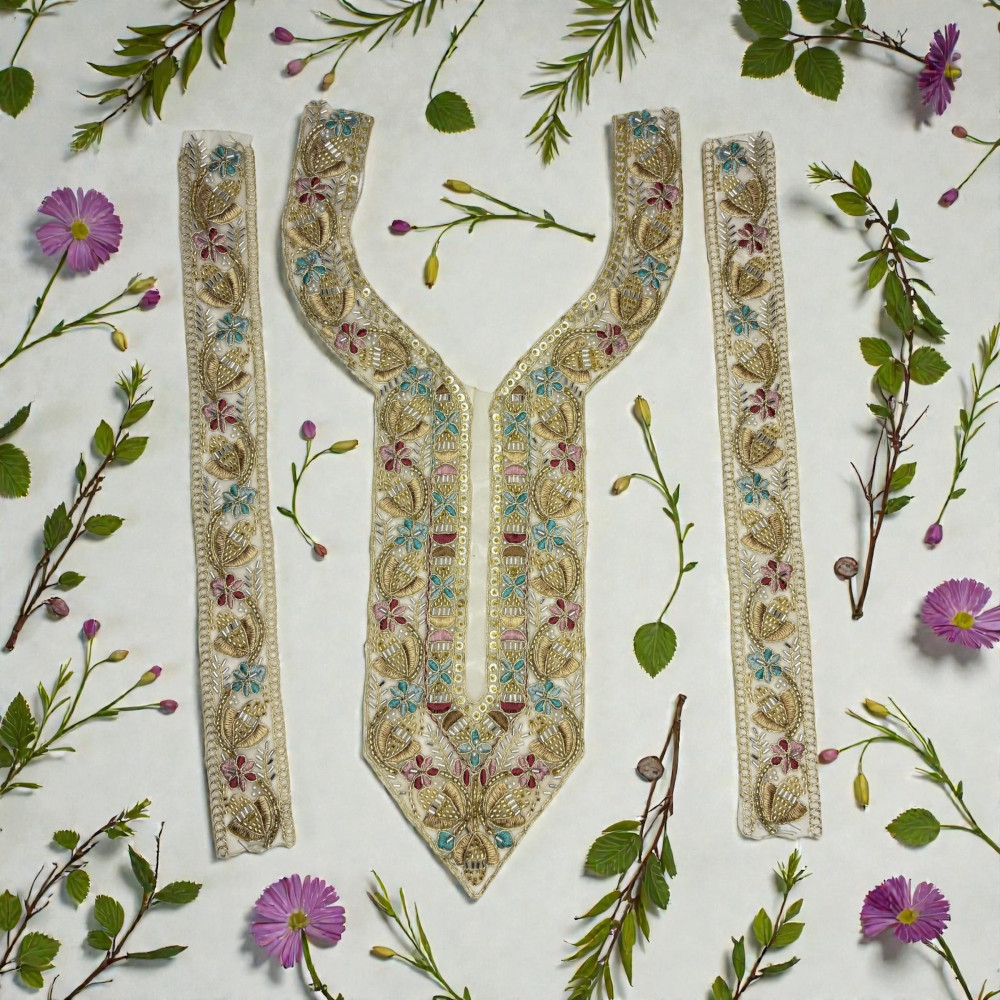 Ready-made neck designs are widely used in dresses, kurtas, and salwar suits to add instant elegance and richness to any outfit. Crafted with beautiful embroidery work, fine handwork, and decorative detailing, these neck pieces enhance the front neckline of garments without the need for heavy stitching or design work. Each neck pattern is carefully designed to match traditional, festive, and daily-wear styles, making it easy for designers and tailors to create premium-looking outfits in less time.Available in different shapes and sizes based on the neckline design, these ready necks are perfect for elevating simple fabrics into stylish, finished garments. Their detailed craftsmanship gives every dress a refined and fashionable appearance.