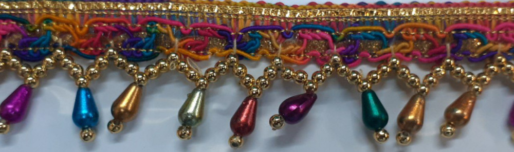 Latkan Lace is a beautifully crafted decorative lace designed to add movement, charm, and elegance to ethnic garments. Made with rich zari braids and adorned with hanging elements such as pearls, crystal beads, glass drops, and colorful beads, this lace creates a graceful dangling effect that enhances the overall look of the outfit.