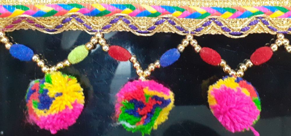 Latkan Lace is a beautifully crafted decorative lace designed to add movement, charm, and elegance to ethnic garments. Made with rich zari braids and adorned with hanging elements such as pearls, crystal beads, glass drops, and colorful beads, this lace creates a graceful dangling effect that enhances the overall look of the outfit.