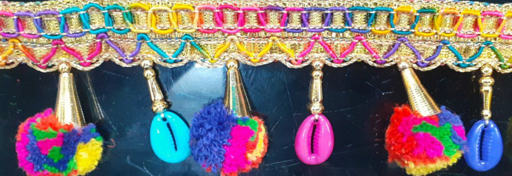Latkan Lace is a beautifully crafted decorative lace designed to add movement, charm, and elegance to ethnic garments. Made with rich zari braids and adorned with hanging elements such as pearls, crystal beads, glass drops, and colorful beads, this lace creates a graceful dangling effect that enhances the overall look of the outfit.