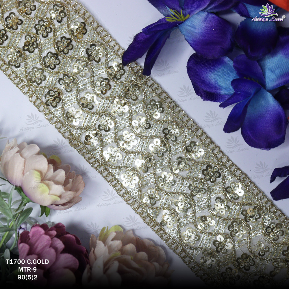 Tissue 6mm sequin lace is a luxurious and high-shine trim popularly used in sarees, dupattas, lehengas, and festive garments. Crafted on a shimmering tissue fabric base, this lace is beautifully enhanced with 6mm sequins, intricate embroidery work, and detailed handwork with mirror accents, giving it a rich and elegant festive appeal. The combination of glossy tissue fabric and sparkling sequin–mirror work makes it ideal for premium ethnic and designer outfits.Available in standard 9-meter rolls, this lace is perfect for borders, dupatta edges, blouse sleeves, garment panels, and bridal or party-wear finishing. Its lightweight yet glamorous look makes it a favorite choice for boutiques, designers, and manufacturers seeking a high-value decorative trim.