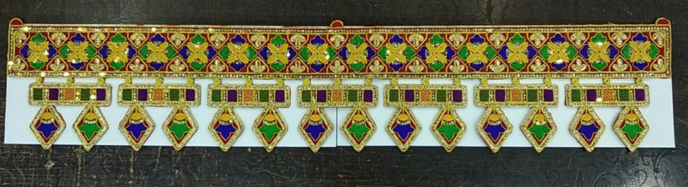 Traditional toran door hanging made with embroidery, mirror work, and handwork. Available in 3–5 feet lengths, it adds a vibrant, festive, and welcoming look to home entrances during festivals and special occasions.