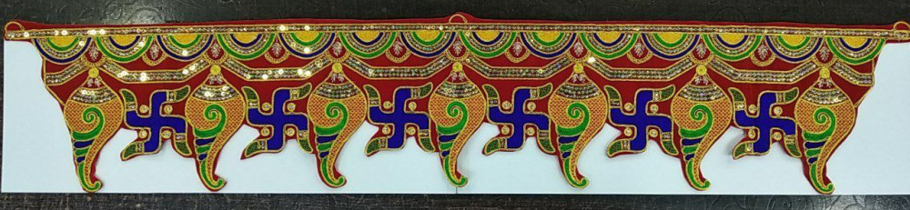 Traditional toran door hanging made with embroidery, mirror work, and handwork. Available in 3–5 feet lengths, it adds a vibrant, festive, and welcoming look to home entrances during festivals and special occasions.